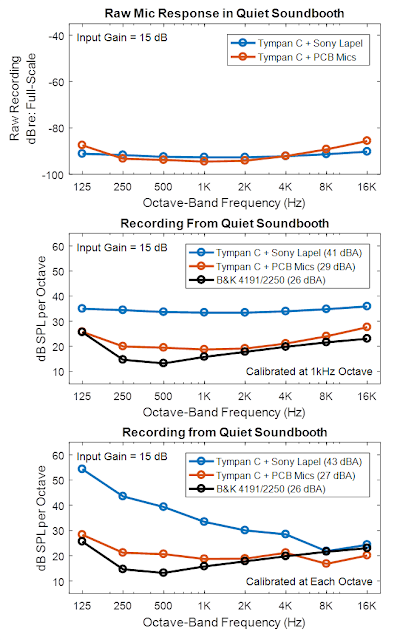 Setup: I performed the recordings in our single-walled acoustic test chamber in the basement of our building. It is fairly quiet, though it is not as quiet at the lowest frequencies (125 Hz and below). As shown in the figure at the top of this post, I put the lapel microphone and the B&K microphone very close to the Tympan's built-in PCB mic.