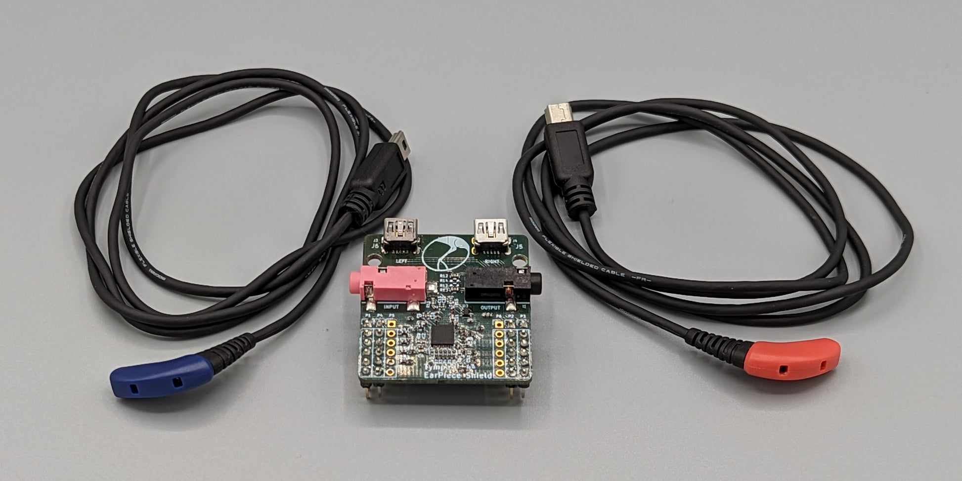 Each Tympan Earpiece Kit comes with right and left earpieces with 1M cable, and the Tympan Earpiece Shield that connects to Tympan Rev D and Tympan Rev C. The kit works out-of-the-box with example sketches from our Arduino Library.